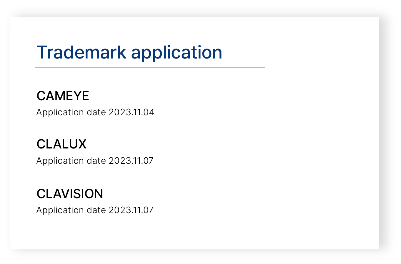 CAMEYE is expanding its presence through domestic patent applications, registered patents, and trademark applications.